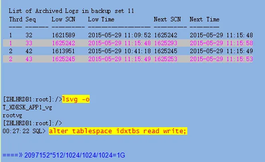 ④ 本篇BLOG中命令的输出部分需要特别关注的地方我都用灰色背景和粉红色字体来表示,比如下边的例子中,thread 1的最大归档日志号为33,thread 2的最大归档日志号为43是需要特别关注的地方;而命令一般使用黄色背景和红色字体标注;对代码或代码输出部分的注释一般采用蓝色字体表示。