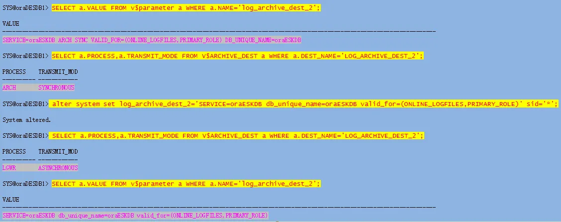 SELECT a.PROCESS,a.TRANSMIT_MODE FROM V$ARCHIVE_DEST a WHERE a.DEST_NAME='LOG_ARCHIVE_DEST_2';