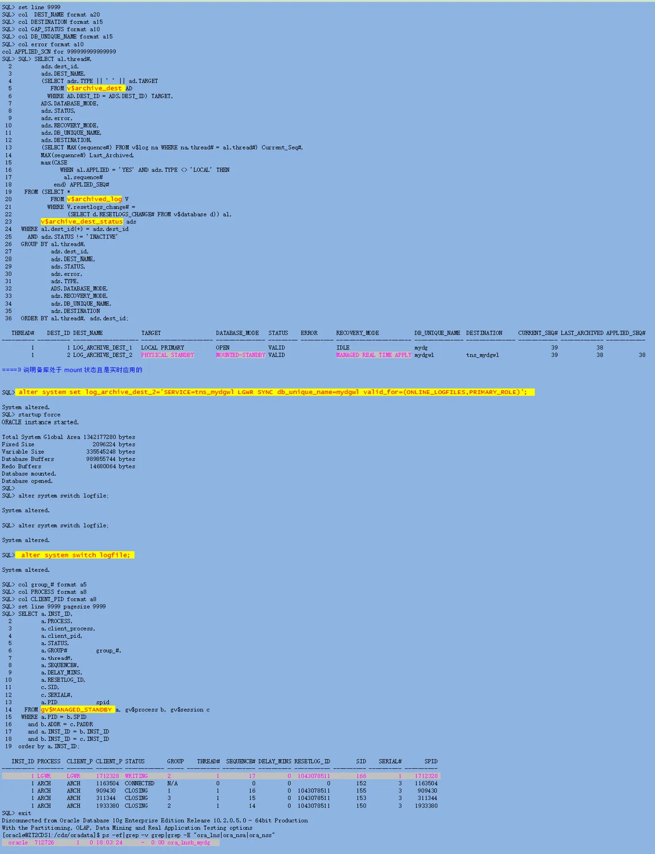 - 推荐: 备库启动实时应用后,主库alter system set log_archive_dest_state_2='defer'; alter system switch logfile; alter system set log_archive_dest_state_2='enable'; alter system switch logfile;