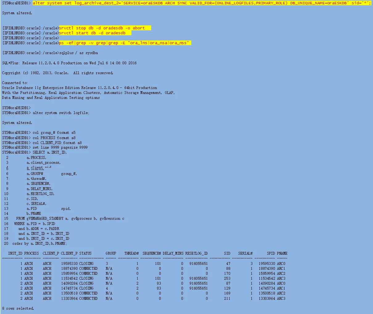 SELECT a.PROCESS,a.PID,a.STATUS,a.GROUP#,a.SEQUENCE#, a.DELAY_MINS, a.RESETLOG_ID FROM V$MANAGED_STANDBY a;