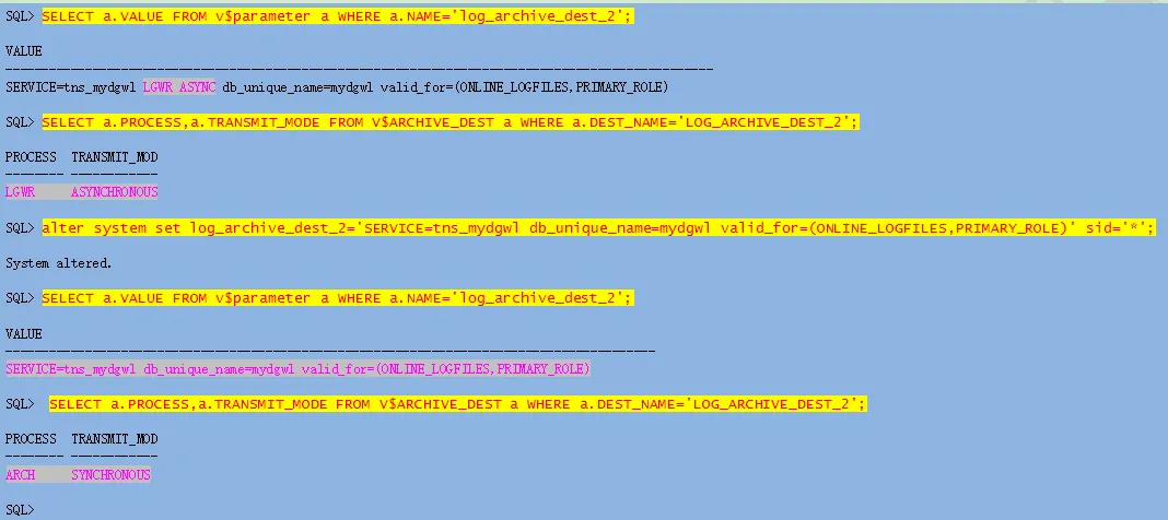 alter system set log_archive_dest_2='SERVICE=tns_mydgwl LGWR SYNC db_unique_name=mydgwl valid_for=(ONLINE_LOGFILES,PRIMARY_ROLE)';