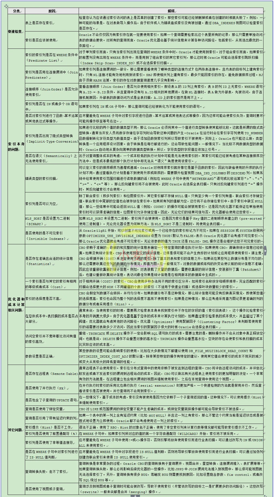 “为什么索引没有被使用”是一个涉及面较广的问题。有多种原因会导致索引不能被使用。首要的原因就是统计信息不准,第二原因就是索引的选择度不高,使用索引比使用全表扫描效率更差。还有一个比较常见的原因,就是对索引列进行了函数、算术运算或其他表达式等操作,或出现隐式类型转换,导致无法使用索引。还有很多其它原因会导致不能使用索引,这个问题在MOS(MOS即My Oracle Support)“文档1549181.1为何在查询中索引未被使用”中有非常详细的解释,作者已经将相关内容发布到BLOG(http://blog.itpub.net/26736162/viewspace-2113670/)上了。下面是一些非常有用的检查项目。