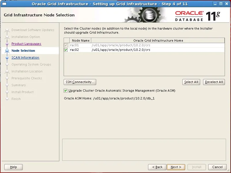 1).升级Grid Infrastructure(Clusterware)。 <<<<如下图所示,直接用Grid Infrastructure 11.2.0.4版本的安装介质升级。