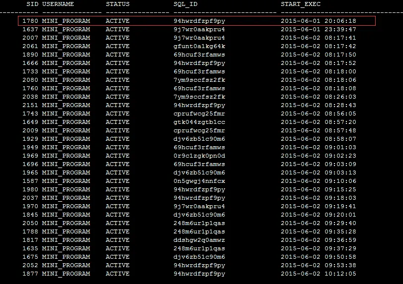 select sid,username,status,sql_id,to_char(logon_time,'yyyy-mm-dd hh24:mi:ss') start_exec