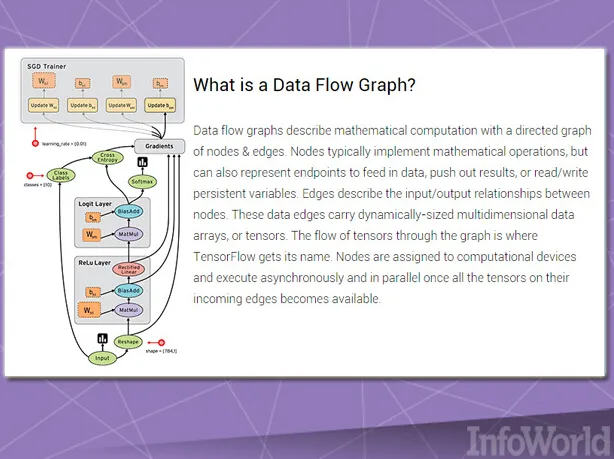 TensorFlow能够实现所谓数据流图谱,其中批量数据(即‘tensor’,意为张量)可通过一系列由图谱描述的算法进行处理。系统之内往来移动的数据被称为“流”,可由CPU或者GPU负责处理。谷歌公司的长期规划在于通过第三方贡献者推动TensorFlow项目的后续发展。