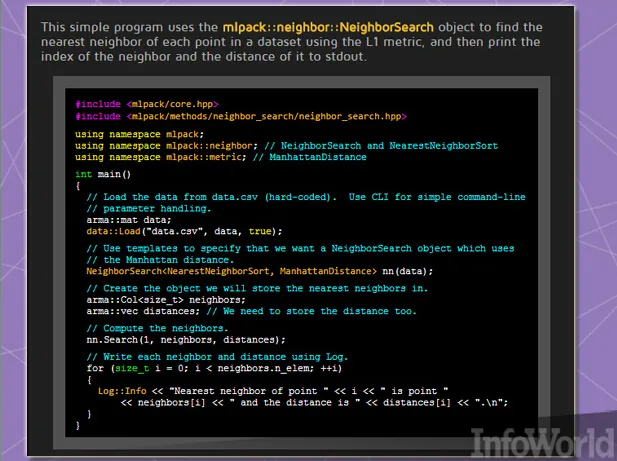 mlpack这套基于C++的机器学习库最初诞生于2011年,其设计倾向为“可扩展性、速度性与易用性,”该库构建者们指出。用户可以通过命令行可执行缓存运行mlpack以实现快速运行、“黑盒”操作或者通过C++ API完成其它更为复杂的任务。