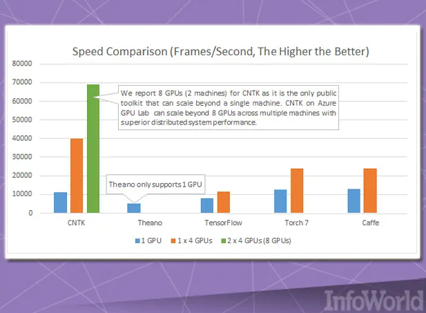 CNTK与谷歌TensorFlow非常类似,因为它允许用户通过有向图的方式建立神经网络。另外,微软还将其视为可与Caffe、Theano以及Torch等项目相媲美的技术成果。它的主要亮点在于出色的速度表现,特别是以并行方式利用多CPU与多GPU的能力。微软公司宣称,其利用CNTK与Azure之上的GPU集群共同将Cortana语音识别服务训练的速度提升到了新的数量级。