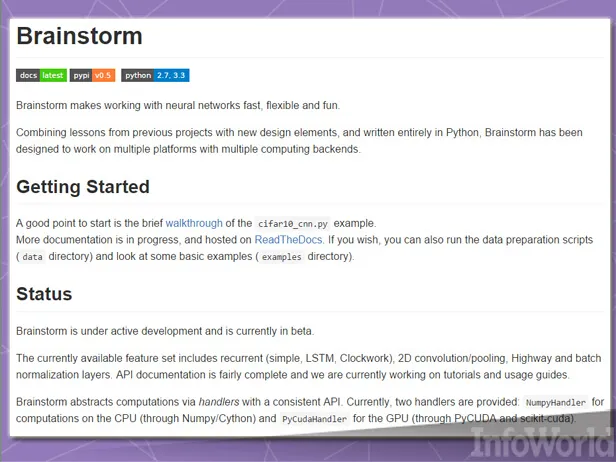 Brainstorm采用Python代码以提供两套“hander”,或者称之为数据管理API——其一来自Numpy库以实现CPU计算,其二通过CUDA使用GPU资源。大部分工作由Python脚本完成,所以各位没办法指望其提供丰富的GUI前端——大家需要自己动手接入相关界面。不过从长期规划角度看,其能够使用“源自多种早期开源项目的学习经验”,同时利用“能够与多种平台及计算后端相兼容的新的设计元素。”