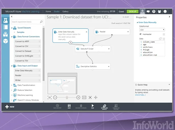 Azure ML Studio允许用户创建并训练模型,而后将其转化为能够由其它服务消费的API。每个用户账户能够为模型数据提供最高10 GB存储容量,不过大家也可以将自己的Azure存储资源连接至服务当中以承载规模更大的模型。目前可用算法已经相当可观,其分别由微软自身以及其它第三方所提供。大家甚至不需要账户即可体验这项服务; 用户可以匿名登录并最多使用八小时Azure ML Studio。