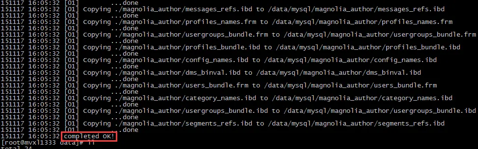如果直到copy-back都没有出问题的话,那么一般就算是正常恢复了,先修改文件夹权限(chown -R mysql:mysq: mysql),然后启动mysql
