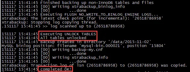 如果一切没有问题,那么在最后会有如下输出,可以看到还是有锁表的,虽然备份的速度比较快,还是要注意一下对业务的影响;