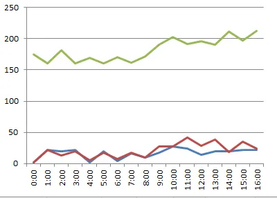 蓝色的部分是优化之后,每小时200万的时候数据库的负载曲线。