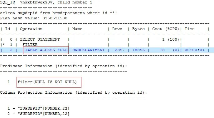 查看执行计划可以很明显看到Filter的处理,里面的条件很微妙NULL IS NOT NULL
