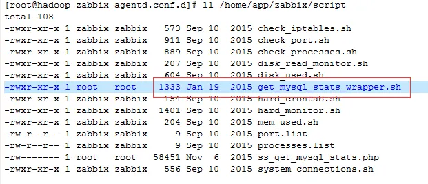 因为这个插件是客户端的,所以选择了一台服务器在客户端查看。到达了相应的安装目录下,假设为:/home/app/zabbix/zabbix_agentd.conf.d/