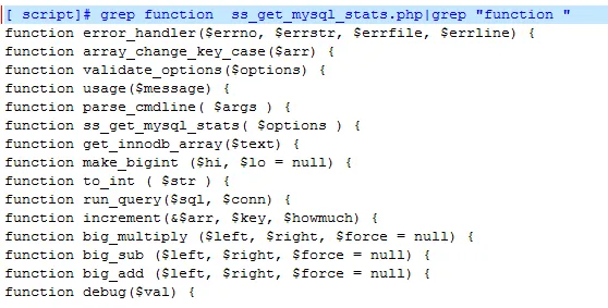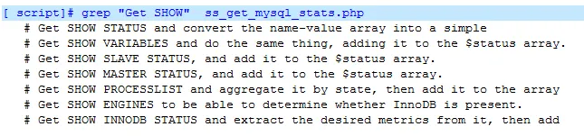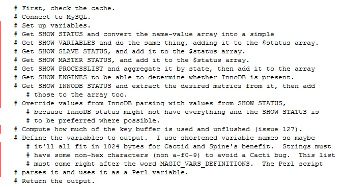 通过这个简单的分析可以看到,这个脚本是基于一些看似简单的命令来得到一个MySQL的状态信息,而且从代码里也可以看到它也会对数据做一些二次处理,比如做一些数值统计。