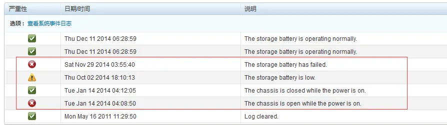 如果看到下面的系统日志,就会发现早在2014年就出现了一些警告和问题,随后看似已经修复了部分,但是实际情况是这台服务器的电源已经坏了一个,另外一个已经快扛不住了。但是通过这些信息就很难读到之前的问题,因为问题已经过去了好久,一直没有问题,应该就是没有问题吧,或者之前的人已经处理了吧,如果这样想,是一种乐观的方式。