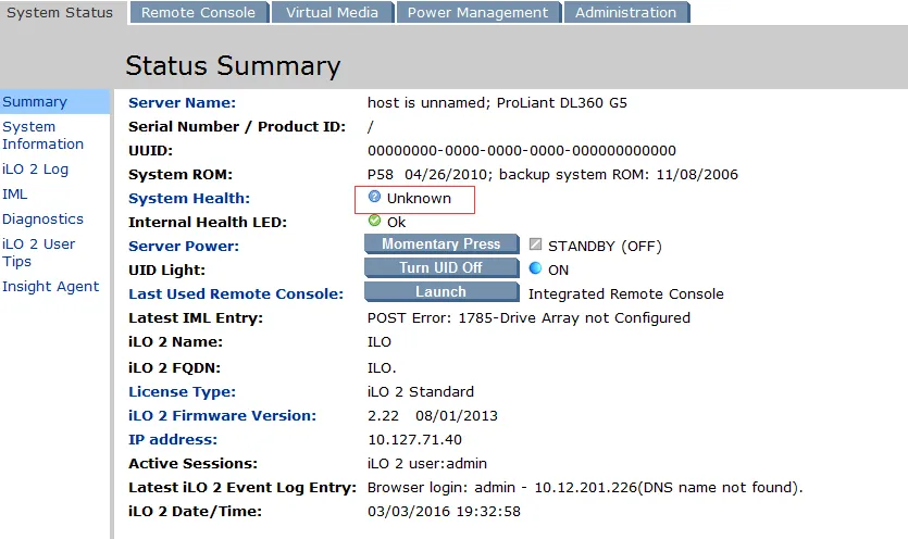 这部凌晨就收到了报警,然后发现这台服务器不可用了。登录ILO之后,发现系统健康情况为Unknown,已经无法连通了。