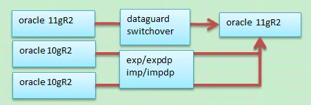类似下面的情况,首先在一台新的服务器上安装11gR2的软件,然后把11g的库做成dataguard的形式,然后switchover,这样11g的库就迁移出去了,然后对于10gR2的库来说,因为数据量不大,可以考虑直接逻辑导出导入即可。当然前提是这几个数据库中的用户表没有冲突。