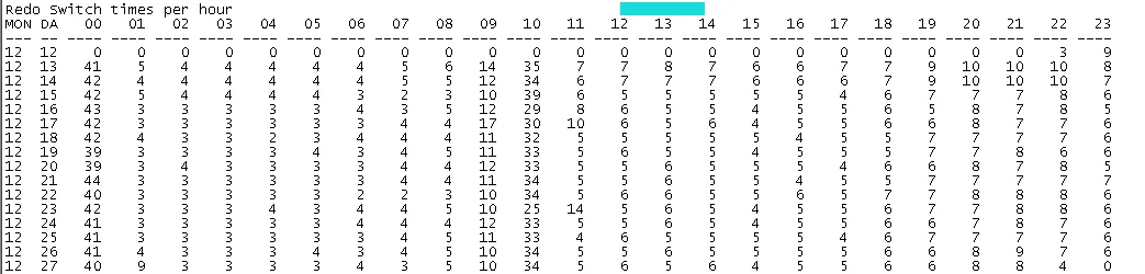 当然回过头来,这么多空间都消耗在哪里了。可以从下面的图形看出,其实最近的归档切换频率在凌晨会有一个小高峰,应该是批量的数据处理。之后基本趋于稳定。