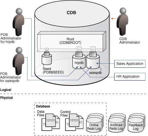 这个图是官方的,我觉得实在弄不出比这个更好的图了,直接贴出来。这个里面的CDB就是容器,PDB就是插件数据库,hrpdb,salespdb都有对应的PDBA来管理,综合的管理由CDB管理员来负责。Root是存储了容器的基本模板,而seed则是提供了一套模板机制。可以基于seed模板来创建对应的PDB,我要演示的也是这个方法。