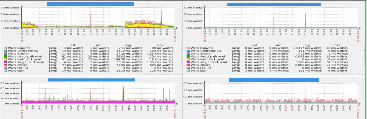 比如我们收到了下面的形式的邮件,描述的是4台DB在过去的24个小时内的等待事件,是不是相对来说感觉要清晰一些,当然我们还可以扩展其它的监控项。
