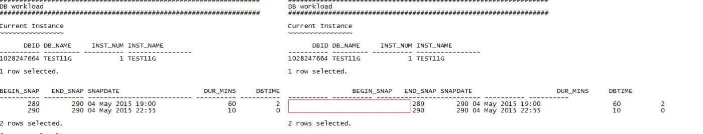 BEGIN_SNAP END_SNAP SNAPDATE DUR_MINS DBTIME