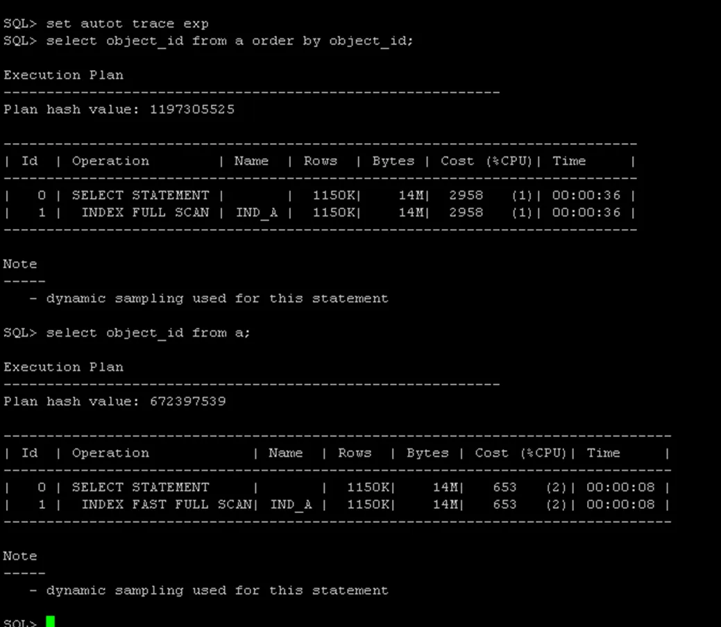 如果要对索引列作排序,这个时候可以使用索引全扫描,通过下面的执行计划可以看到快速扫描和全扫描的差别。