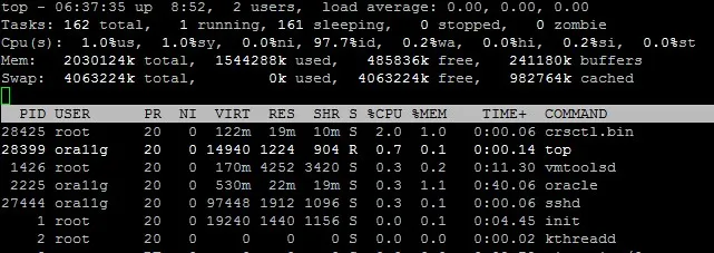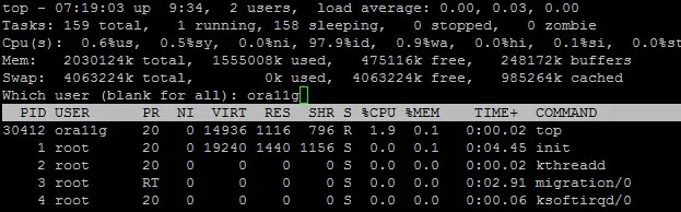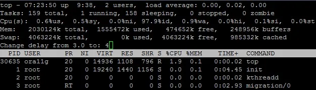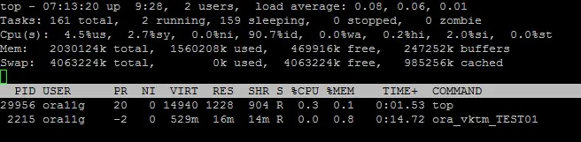 第3行显示了cpu的一些负载信息,这个也是top命令的比较实用的一个功能。特别是%id和%wa这两个指标尤为重要,很多的性能问题中,如果%id过低,%wa也很低,说明cpu使用率很高,可能有一些sql语句消耗了大量的cpu资源,如果%wa很高的话,很可能是系统IO出现了问题。在以往的系统升级中,如果发现%wa过于10%,就说明IO等待很高了,可以通过dd等方式做一个简单的测试。