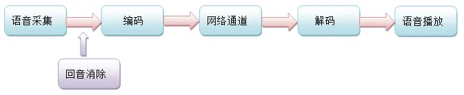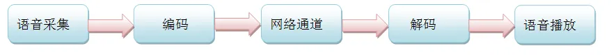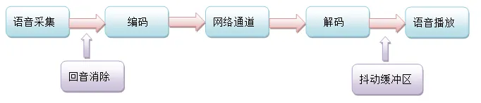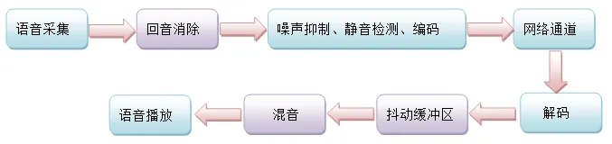 网络语音通话通常是双向的,就模型层面来说,这个双向是对称的。为了简单起见,我们讨论一个方向的通道就可以了。一方说话,另一方则听到声音。看似简单而迅捷,但是其背后的流程却是相当复杂的。我们将其经过的各个主要环节简化成下图所示的概念模型:
