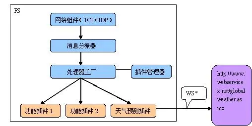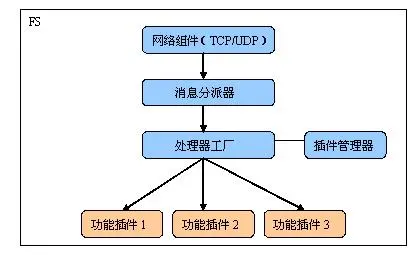 上文讲述的是AS中的基于连接池的消息处理器,现在我们把焦点转移到功能服务器FS上来,看看FS上消息分派的过程。当FS接收到到一个请求后,会从已加载的功能插件列表中选择一个合适的插件来处理这个消息,而每一个功能插件就相当于一个消息处理器。FS和AS的结构一致: