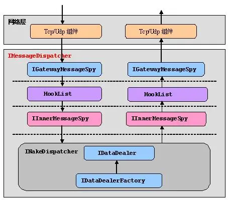 从IMessageDispatcher的组件结构图和接口的定义可以看出,IMessageDispatcher保证了将接受到的消息按照规定的顺序经过各个Spy、Hook、消息处理器等组件。任何消息不得例外。即使是系统内部生成的消息(如发给客户端的通知),也必须经过IMessageDispatcher的BeforeSendMessage后才可安全的发送出去。