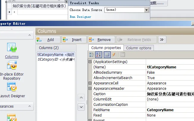 点击Run Designer,先添加两列,设置他们的FieldName,这样用来绑定数据;分类编号的Visible=false可以进行隐藏;