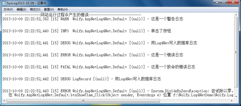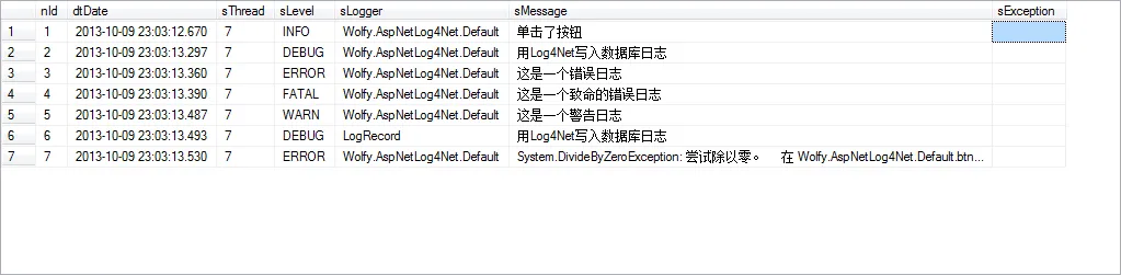 6 myLogger.Debug("用Log4Net写入数据库日志");