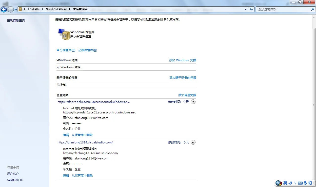 点击“开始”--“控制面板”--“用户帐户和家庭安全”--“凭据管理器”--“普通凭证”,就修改普通凭证就可以了。