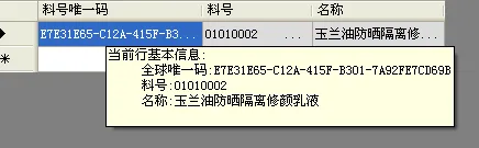 1 private void dgvProduct_CellMouseEnter(object sender, DataGridViewCellEventArgs e) 2 { 3 if (e.ColumnIndex != -1 && e.RowIndex != -1) 4 { 5 if (ds1 != null && dgvProduct.CurrentRow.IsNewRow == false && dgvProduct.CurrentRow.Cells[0].Value.ToString() != "") 6 { 7 if (dgvProduct[dgvProduct.CurrentCell.ColumnIndex, dgvProduct.CurrentCell.RowIndex].Value.ToString() != "") 8 { 9 dgvProduct[e.ColumnIndex, e.RowIndex].ToolTipText = "当前行基本信息:" + "\n"; 10 dgvProduct[e.ColumnIndex, e.RowIndex].ToolTipText += " 全球唯一码:" + dgvProduct[0, dgvProduct.CurrentCell.RowIndex].Value + "\n"; 11 dgvProduct[e.ColumnIndex, e.RowIndex].ToolTipText += " 料号:" + dgvProduct[1, dgvProduct.CurrentCell.RowIndex].Value + "\n"; 12 dgvProduct[e.ColumnIndex, e.RowIndex].ToolTipText += " 名称:" + dgvProduct[2, dgvProduct.CurrentCell.RowIndex].Value + "\n"; 13 14 15 } 16 } 17 18 } 19 }