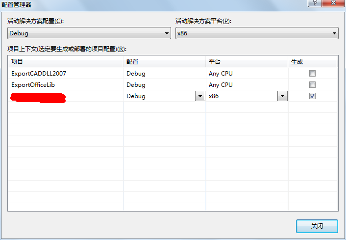 在VS主菜单上选择“生成”——“配置管理器”,设置生成平台为x86(如果没有就新建一个),如下图所示: