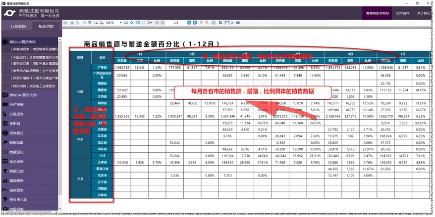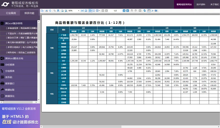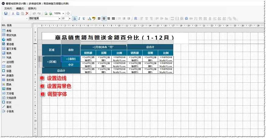 矩表控件能够满足多维透视表创建的复杂功能。本文以【商品销售额与赠送金额百分比】这一典型的多维透视表为示例,使用葡萄城报表的矩表控件,通过拖拽来实现多维透视表。