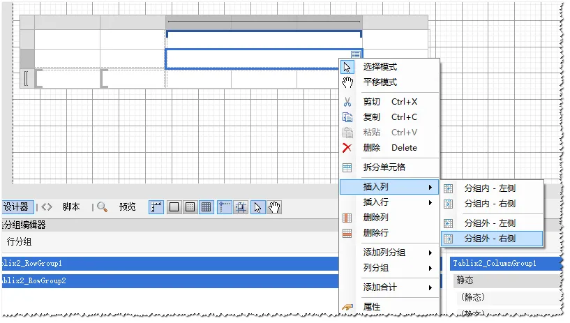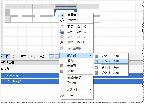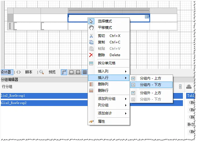 添加矩表控件到设计界面,会发现有类似[ 符号,表示分组,即可根据具体数据动态生成行。会发现设计器下面的矩表分组管理器;