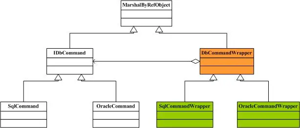 2.在Enterprise Library中的DAAB中有一个DbCommandWrapper的包装类,它实现了对IDbCommand类的包装并提供了参数处理的功能。结构图如下: