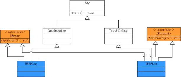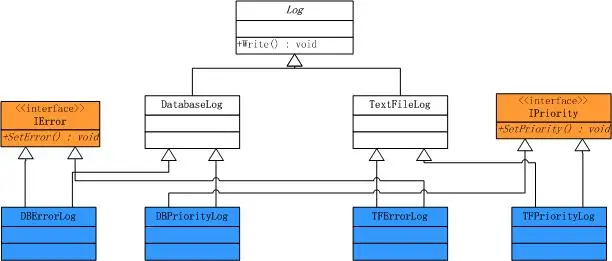 此时可以看到,如果需要相应的功能,直接使用这些子类就可以了。这里我们采用了类的继承方式来解决了对象功能的扩展问题,这种方式是可以达到我们预期的目的。然而,它却带来了一系列的问题。首先,前面的分析只是进行了一种功能的扩展,如果既需要记录错误严重级别,又需要记录优先级时,子类就需要进行接口的多重继承,这在某些情况下会违反类的单一职责原则,注意下图中的蓝色区域:
