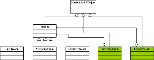 可以看到, BufferedStream和CryptoStream其实就是两个包装类,这里的Decorator模式省略了抽象装饰角色(Decorator),示例代码如下: