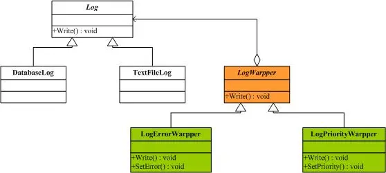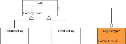 现在又该是Decorator模式出场的时候了,解决方案是把Log对象嵌入到另一个对象中,由这个对象来扩展功能。首先我们要定义一个抽象的包装类LogWrapper,让它继承于Log类,结构图如下: