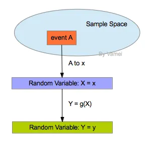 我们使用随机变量的函数,来定制新的随机变量。随机变量的函数是从旧有的随机变量到一个新随机变量的映射。通过函数的映射功能,原有随机变量对应新的随机变量。通过原有随机变量的概率分布,我们可以获知新随机变量的概率分布。事件,随机变量,随机变量函数的关系如下: