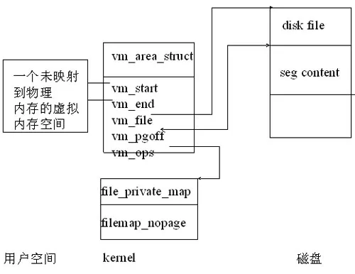 3、为pte[j]分配一个真正的物理内存页面,依据vm_area_struct中的vm_file、vm_pgoff和vm_ops,调用filemap_nopage将磁盘file中vm_pgoff偏移处的内容读入到该物理页面中,如下图所示: