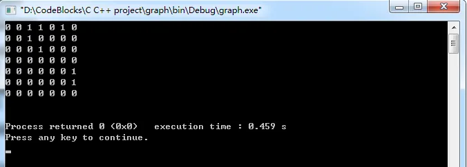 #include<stdio.h> #include<stdlib.h> #include<string.h> #include<malloc.h> #define MAX 100 typedef struct graph { char vexs[MAX]; int vexnum; int edgnum; int matrix[MAX][MAX]; } Graph,*graph; static int get_position(Graph g,char ch) { int i; for(i=0;i<g.vexnum;i++) if(g.vexs[i]==ch) return i; return -1; } graph create_graph() { char vexs[]= {'A','B','C','D','E','F','G'}; char edges[][2]= {{'A','C'},{'A','D'},{'A','F'},{'B','C'},{'C','D'},{'E','G'},{'F','G'}}; int vlen=sizeof(vexs)/sizeof(vexs[0]); int elen=sizeof(edges)/sizeof(edges[0]); int i,p1,p2; Graph *pG; if((pG=(graph)malloc(sizeof(Graph)))==NULL) return NULL; pG->edgnum=elen; pG->vexnum=vlen; for(i=0;i<pG->vexnum;i++) pG->vexs[i]=vexs[i]; for(i=0;i<pG->edgnum;i++) { p1=get_position(*pG,edges[i][0]); p2=get_position(*pG,edges[i][1]); pG->matrix[p1][p2]=1; } return pG; } void print_graph(Graph G) { int i,j; for(i=0;i<G.vexnum;i++) { for(j=0;j<G.edgnum;j++) { printf("%d ",G.matrix[i][j]); } printf("\n"); } printf("\n"); } int main() { Graph *pG; pG=create_graph(); print_graph(*pG); }