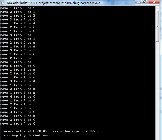 #include<iostream> #include<stack> using namespace std; struct op { int begin; int end; char A; char B; char C; op(int start,int end,int A,int B,int C):begin(start),end(end),A(A),B(B),C(C) {} }; void hanoi(int start,int end,char A,char B,char C) { stack<op> st; op tmp(start,end,A,B,C); st.push(tmp); while(!st.empty()) { tmp=st.top(); st.pop(); if(tmp.begin!=tmp.end) { st.push(op(tmp.begin,tmp.end-1,tmp.B,tmp.A,tmp.C)); st.push(op(tmp.end,tmp.end,tmp.A,tmp.B,tmp.C)); st.push(op(tmp.begin,tmp.end-1,tmp.A,tmp.C,tmp.B)); } else cout<<"move "<<tmp.begin<<" from "<<tmp.A<<" to "<<tmp.C<<endl; } } int main() { hanoi(1,5,'A','B','C'); }