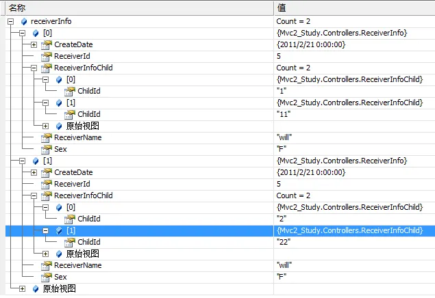 并为类ReceiverInfo增加一个属性public List<ReceiverInfoChild> ReceiverInfoChild { get; set; }