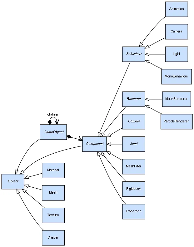 要注要 Mesh 和 Material 对象并非 Component,它们是继承自 Object 的。你可以动态改变它们。但由于它们不是 Component ,所以可以被分享,例如多个 GameObject 的 MeshRenderer 都参考到同一个 Material。一个 Component 实例只属于一个 GameObject (所以在 UML 中我用黑色钻石表示 Composition)。 而 Light 和 Camera 则是 Component,这意未着可以简单的设定联结。