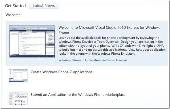 开发 Windows Phone 7 系列的手机应用程序与在Visual Studio中开发 Silverlight 或 XNA 应用程序十分类似。Visual Studio 2010 Express for Windows Phone 版本的起始页提供了可帮助您入门的学习资源。