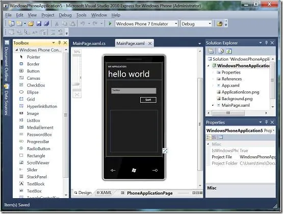 - Windows Phone 7 系列仿真程序 – 它集成在Visual Studio里,使您能够实时查看并调试您的应用程序,就像调试任何其他VS项目一样。